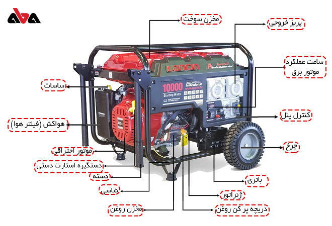 یک موتور برق از پنج بخش اصلی موتور، دینام، استارت، مخزن سوخت و پریز خروجی تشکیل شده است. سوختهای فسیلی (عموماً بنزین یا گازوئیل) از طریق ورودی خاصی به داخل مخزن سوخت وارد میشوند. پس از روشن شدن موتور برق، سوخت انرژی لازم برای شروع فرآیند احتراق را تأمین میکند. موتور به حرکت خود ادامه میدهد و این حرکت باعث چرخش دینام میشود. دینام با ایجاد یک میدان الکترومغناطیسی برق تولید میکند. در نهایت، جریان الکتریسیته از طریق رگولاتور به شکل برق قابل استفاده تبدیل میشود. برق تولیدشده از طریق پریز یا پریزهای موجود در موتور برق، برای تأمین انرژی وسایل الکتریکی مورد نیاز شما در دسترس قرار میگیرد.
